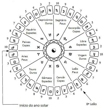 Cada uma das 36 cartas menores representam um decano (10º) da roda do ano: