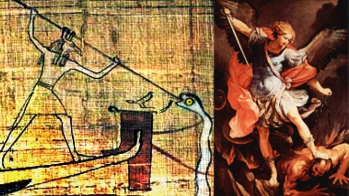 À esquerda: Set destruindo Apep. À direita: O arcanjo Miguel destruindo Satã. Percebeu a semelhança?